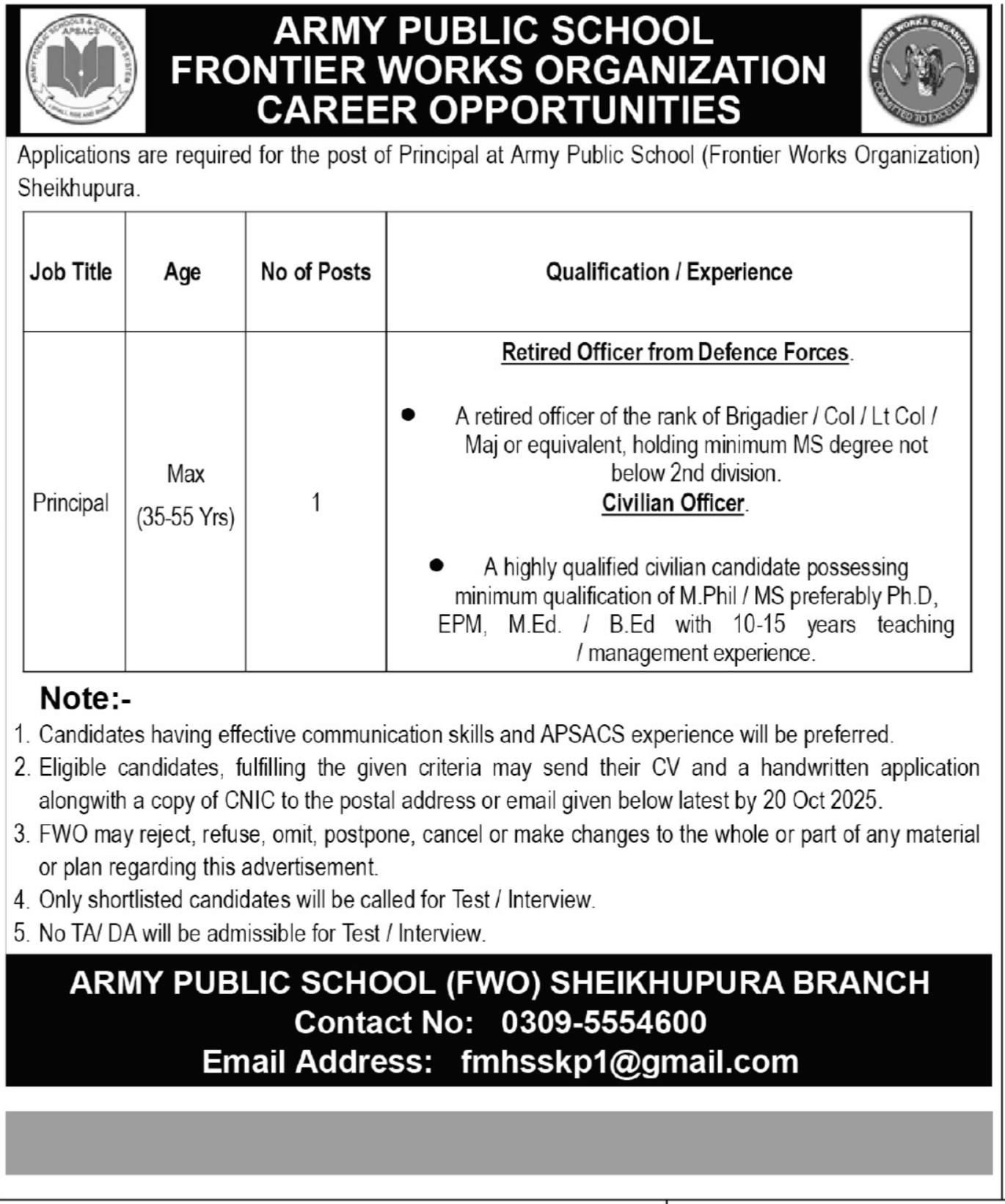 Frontier Works Organization (FWO) Sheikhupura is Hiring – Apply Now! Full Time